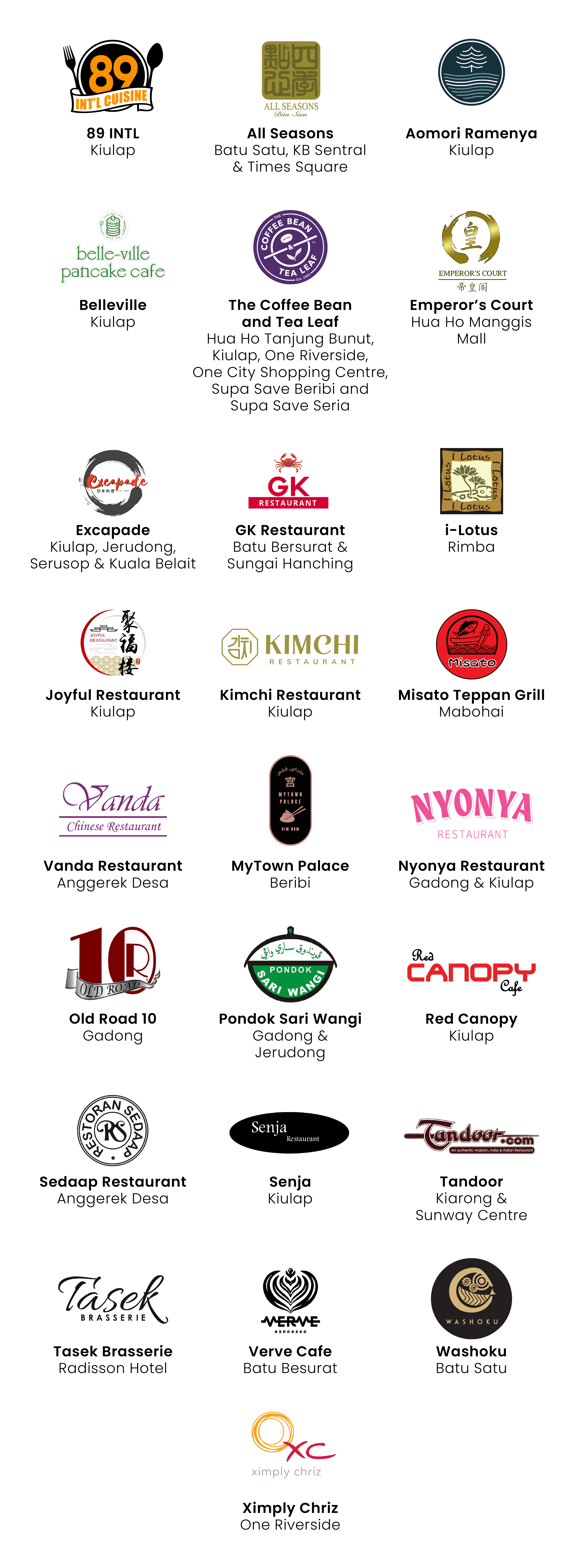 3.4 For the purpose of this Promotion, the list of participating merchants (each a “Participating Merchant”, collectively “Participating Merchants”) is as follows: