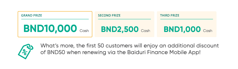 3.4 The first 50 HP accountholders to subscribe or renew to HP Care through the Baiduri Finance Mobile App will receive an additional BND50 discount.